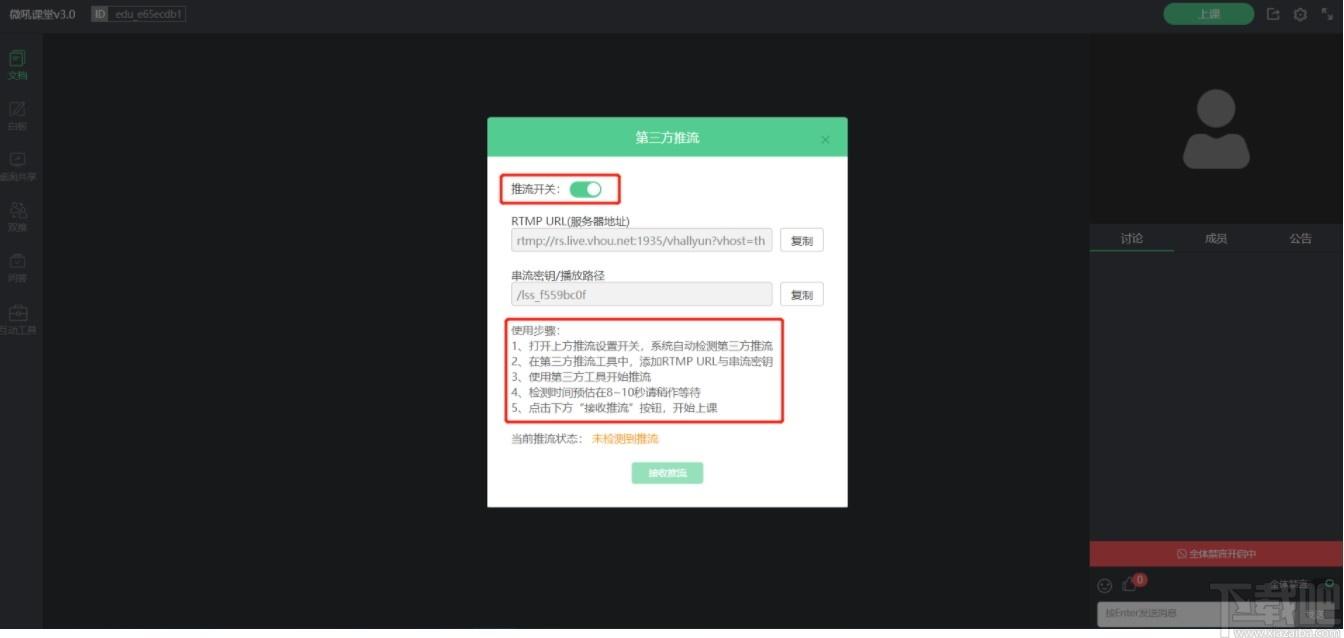 优化第三方推流功能,新增“推流设置”开关,细化使用步骤文字说明,避免“僵尸流”影响讲师正常授课与使用计费。